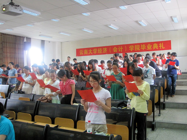 下午两点三十分,毕业典礼在雄壮的国歌声中正式开始。庆典仪式首先进行了德赢ac米兰官方合作vwin(会计学院)第二届“国家开发银行金融励志奖学金”。“国家开发银行金融励志奖学金”由国家开发银行通过向中国金融教育发展基金会捐款,支持设立,用于奖励西部及沿边地区重点高校家庭贫困、品学兼优的大学生。每届共奖励10名学生,每人一次性奖励金额为3000元。此为第二届,我院共10位优秀学生获得“国家开发银行金融励志奖学金”。2010级金融学专业研究生梁任敏同学代表全体获奖学生发言,他首先代表全体荣获奖学金的同学表达对国家开发银行的感激之情,并感谢学校与学院的各位老师的培养,同时代表全体受助同学郑重承诺:“人生有涯而恩情无边,此时此刻充盈在我们心中的是无尽的感激。获此殊荣,让我们更加坚定自己的信念。作为一名21世纪的大学生应该具有蟾宫折桂的勇气和百折不挠的韧劲。我们会以诚实、勤奋和向上的心态勇敢面对生活中的困难。展望明天,我们仍然会带着感恩的心踏踏实实一步一个脚印去迎接未来的挑战。在以后的日子里,我们会努力学习,辛勤工作,不辜负学校及国家对我们的期望,以实际行动回报社会。”