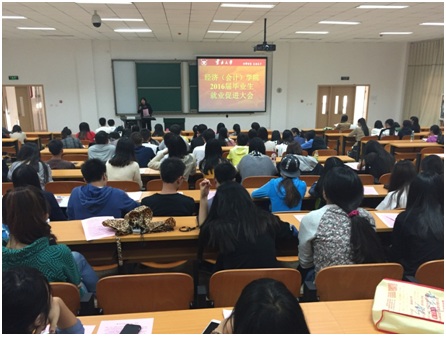 10月20日下午,经济(会计)学院2016届毕业生就业促进大会在文汇楼2418顺利开展。经济(会计)学院党委副书记李娟老师、学工办主任刘岚老师、研究生辅导员邓碧慧老师、研究生班主任徐琰超老师、原院学工办主任王守义老师以及2016届毕业生们参加了本次大会。