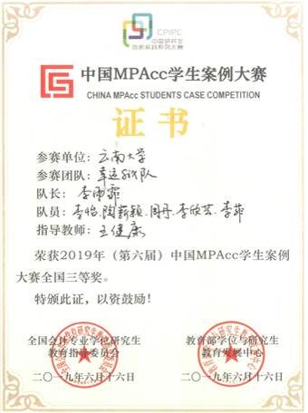 作为“中国研究生创新实践系列大赛”主题赛事之一,历时3个月的2019年(第六届)中国MPAcc学生案例大赛近日在江城武汉圆满落幕,由德赢ac米兰官方合作vwin2018级MPAcc研究生李雨霏、李菲、李怡、李欣芸、陶薪颖、周丹组成,王健康老师指导的“幸运Six”团队,一路披荆斩棘,进入全国总复赛决赛,并通过激烈的角逐,获得“全国三等奖”及“最佳创意奖”。这也是德赢ac米兰官方合作vwinMPAcc研究生团队在该赛事举办六届以来连续第六次晋级初赛第二阶段、连续第四次晋级全国十强复赛决赛。由德赢ac米兰官方合作vwin2016级会计学专业本科生郎玮、张誉警、王欣媛、颜丽君组成,王健康老师指导的“虎虎虎兔”团队也以赛区第三名的成绩,荣获全国本科生代表队优胜奖。