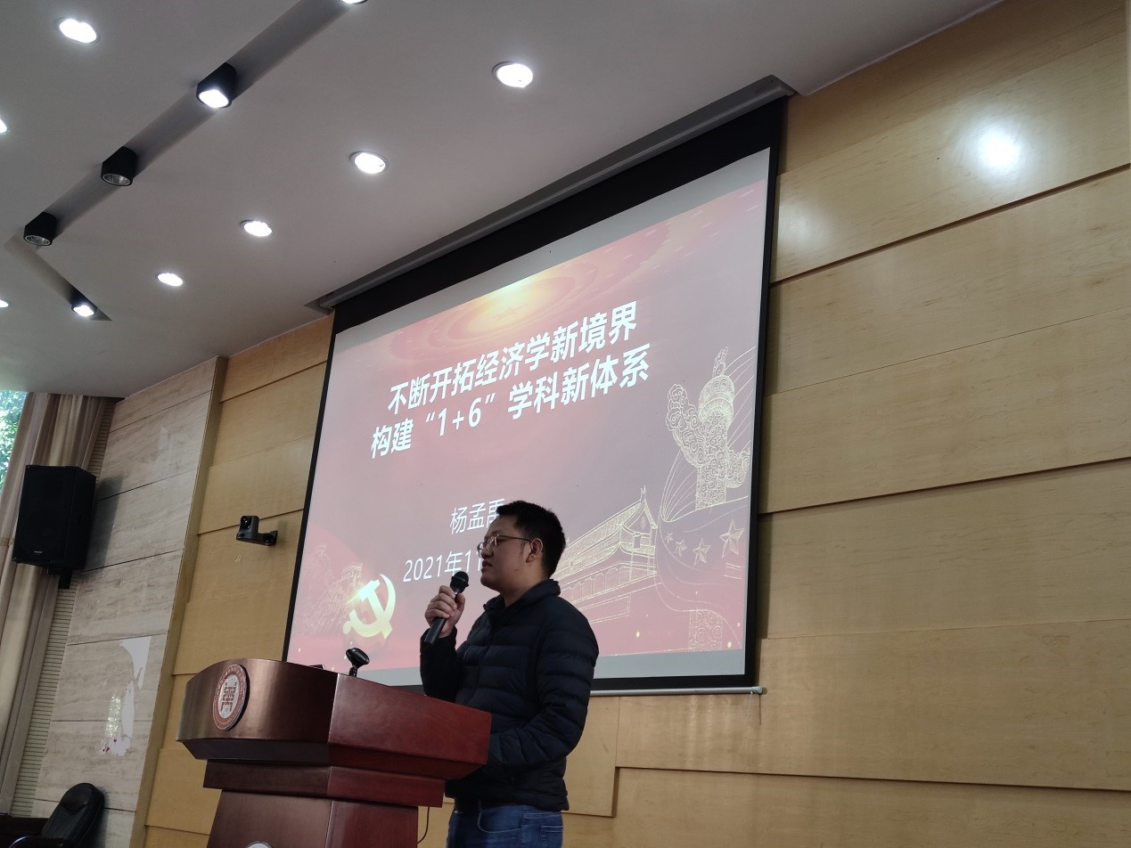 研讨会首先发言的是学生党员,2021级区域经济学硕士研究生邓龄松作为学生代表,结合东非地区工作经历,地区间的经济差异引起了许多思考,从而决心攻读经济学。社科处副处长张剑源进行点评,表示一切伟大的发现都基于提出问题,邓同学以亲身经历回答了“为什么要读书以及为什么要读研”的问题,在学习过程中,需要接近生活,接近实际地提出问题,并不断探索寻找解决的方法。